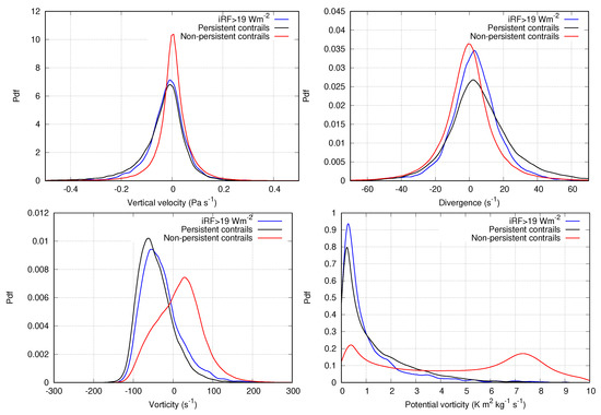 The distributions for the relative vorticity (Figure 4, bottom right) show a large separation between the pdf for the general case (red) and the other two functions. The pdfs for large-iRF (blue) and persistent contrails (black) are narrower and strongly concentrated on the negative side (anticyclonal, clockwise motion) compared to the general case, where the mode value of the distribution is clearly positive (anticlockwise motion). The results agree with [7], since ISSRs also prefer divergent, anticyclonic flow. This variable may help to predict the persistence of contrails, but not to distinguish between persistent contrails of any iRF and those with large iRF, as their density functions still overlap substantially. The overlap in the distributions of the dynamical variables demonstrates that persistent contrails do not only develop during their favoured flow patterns. Only the relative frequency of the patterns is different within and outside of a situation where persistent contrails develop. Therefore, the dynamical fields vertical velocity, divergence, vorticity, and potential vorticity alone are not sufficient to improve the prediction of persistent contrails.