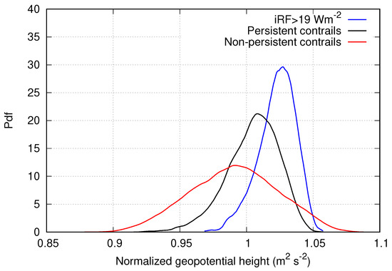 Similar to the vertical velocity, the pdfs of the divergence (Figure 4, top right) are centred around zero as well, with the blue and back lines for persistent contrails and persistent contrails with large iRF slightly shifted towards positive values. Positive values indicate a divergence, and negative values a convergence, of air masses. As most ISSRs occur in a 200 hPa thick layer below the tropopause [18], this shift is probably caused by the outwards spreading of air masses below the tropopause, which acts as a vertical boundary. The large values in this layer promote the development of persistent contrails with high iRF. This is connected to the potential vorticity (Figure 4, bottom right). The extratropical dynamical tropopause is typically found at the 2 PVU potential vorticity surface [19] (1 PVU K m kg s), which is why the pdfs for persistent contrails have their peaks below that level. Contrails also develop in the lower stratosphere, but only rarely. The low probability densities at higher PV values of the blue and black function confirm this. Potential vorticity strongly increases in the stratosphere, which explains the difference in the pdf distribution for the general case.