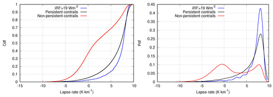 Left panel: cumulative distribution functions (cdfs) of lapse rates found in situations without persistent contrails (red), with persistent contrails (black), and with persistent contrails with large iRF (blue). Right panel: The probability density functions corresponding to the cdfs in the right panel.