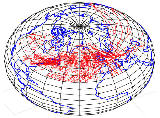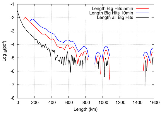 First, we check whether the so-defined Big Hits occur everywhere or perhaps only in special regions. For this, their coordinates are plotted on a world map (see Figure 7) centred on the North-Atlantic flight corridor. This map gives only a weak indication of regions where Big Hits do not occur, where they are perhaps less probable over Greenland. Otherwise, the distribution of the red dots resembles the general distribution of MOZAIC flights within the considered mid-latitude belt. The distribution of red dots is more homogeneous in the main traffic regions than in less-frequented ones, probably because there are simply more data. In regions with fewer flights, the Big Hit locations seem to be a bit scattered or patchy along the track. This is likely caused by the strong variations in the atmospheric relative humidity field. When Big Hits do not always form as coherent tracks along the flight path, the question arises, whether, when, and where their avoidance by flight diversion makes sense. Preventing Big Hits is only effective if they do not appear pointwise and have more than a few kilometres in length. This length should be a not too small fraction of the mean path length of aircraft within ISSRs, that is, 150 km [20].