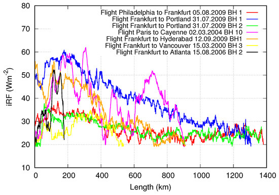Time series of iRF values in a number of situations with consecutive iRF W m that occurred on the flights indicated in the figure.