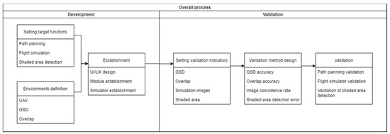 Specifically, a simulator was developed and validated for path planning, flight simulation, and shaded area detection. It was determined that path planning operates in accordance with the target GSD and overlap. Furthermore, it was confirmed that the images obtained through flight simulation were substantially consistent with the images obtained during the actual flight. Finally, it was demonstrated that the shaded area detection function can be used to estimate the quality of the actual product.