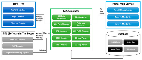 The portal map service module refers to the map service provided by portals, such as V-world, Naver, and Daum in the form of a tile map. The corresponding map service is called through the Portal Map Connector. The database stores spatial information, including two-dimensional (2D) geographic information system (GIS) data, raster data, 3D model data, and metadata, which are not provided by the portal services, to manage the data. The simulator can be applied to an actual or virtual UAV. When applied to an actual UAV, the simulator transmits route information to the UAV using the Micro Air Vehicle Link (MAVLink) protocol. The UAV moves along the route information and sends a log recording the actual photo-taking progress to the simulator. In the case of using a virtual UAV through SITL, the route is transmitted through the MAVLink protocol and the recording log is also transmitted. However, because this is performed through a virtual UAV rather than a real one, a MAVLink converter is used instead of the MAVLink interface.