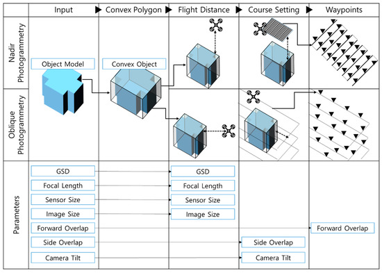 The simulator automatically creates a path to fulfill output qualities such as GSD, forward overlap, side overlap, and camera tilt with respect to focal length, sensor size, and image size. Figure 3 illustrates the process of automatic path planning and the parameters used in nadir and oblique photography. The path planning process comprises creating a convex polygon, determining the distance from the object, determining the course, and determining the shooting waypoints. The path design requires the following inputs: Object model, GSD, focal length, sensor size, image size, forward overlap, side overlap, and camera tilt.