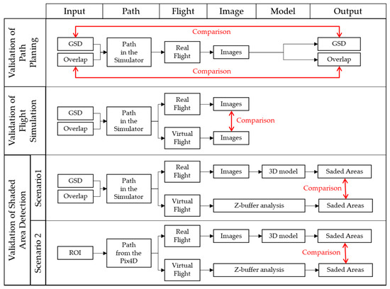 Figure 5 shows the validation process, which is conducted by comparing real and virtual flight data and comparing the estimated and real outputs. Because flight simulation and shading area detection can be performed after path planning, validation of the flight simulation and shading area detection were conducted after validation of the path planning. The performance validation of each function can be quantified using the corresponding performance indicators. Each indicator is designed to be easy for users to understand.