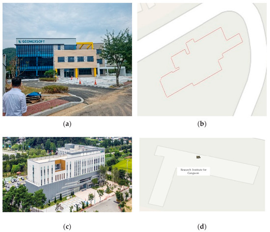 (a) Appearance and (b) boundary of the Geomexsoft office building. (c) Appearance and (d) boundary of the Research Institute for Gangwon building.