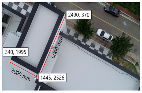 The GSD of the image captured in real flight was compared with that set as the target. Because of the characteristics of the object, depth exaggeration may occur, causing the GSD to change. To remove this exaggeration, an area of interest (AOI) was defined in the object and the GSD for the area was calculated. GSD was computed in both the vertical and horizontal directions because the GSD of the horizontal axis and that of the vertical axis are different.