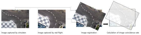 In the validation of the simulation, the coincidence between one image captured by the simulator and another captured by the actual flight is evaluated. This indicates the accuracy of the acquired image in advance without actual flight in the field. Figure 7 shows the measures used to estimate the coincidence.
