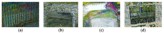 The purpose of the simulator is to check the images captured in advance without the cost of actual flight. According to this viewpoint, the difference between the actual and simulation images has a negative impact on the simulator’s validation. Because the shooting plan calls for an 80% forward overlap and a 60% side overlap, the overlap should be greater than 48% if the camera is directed correctly. In this experiment, the image coincidence reached 86%, and it was at least 83.7% within the 95% confidence interval (Table 8). However, in some images, there were angle differences between the simulation and real images, as shown in Figure 13, which should be improved.