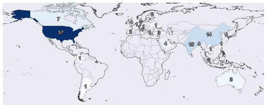 Figure 2 indicates the number of institutions per origin country of each study. Figure 3 shows the publishing year of each article. We found that most institutions only had one study considered in this review. Nevertheless, we found a set of them that stands out with multiple publications, including the NIH (National Institute of Health) with eight studies, Johns Hopkins University with seven studies, Stanford University with four articles, and the University of Toronto, Massachusetts General Hospital, and the University of California with three studies each.