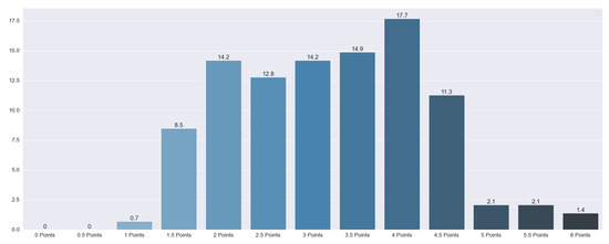 Using the previously defined QA questions, we obtained the results of each study’s quality. The distribution of the punctuation can be seen in Figure 4 and Figure 5: 2 articles were rated with 6 points (1.41%), 3 with 5.5 points (2.13%), 3 with 5 points (2.13%), 16 with 4.5 points (11.4%), 25 with 4 points (17.73%), 21 with 3.5 points (14.89%), 20 with 3 points (14.18%), 18 with 2.5 points (12.77%), 20 with 2 points (14.184%), 12 with 1.5 points (8.51%), and 1 with 1 point (8.51%).