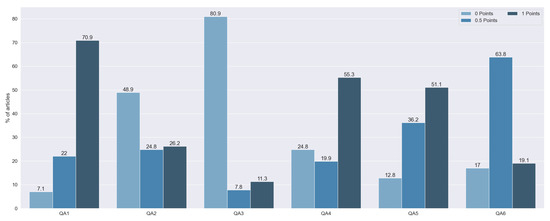 QA1 and QA4 were the most fully answered questions, with 100 studies with 1 point on the first one and 78 with 1 point on the second one. These two questions tried to identify whether the studies provide suitable justification, taking into account the state of the art and the explanation of the topic. The importance of these questions is shown by the fact that we did not find any study that scored 0 points on both of these questions. Of the articles that did not have a full score for both questions, the majority did fail QA4, without explaining the state of the art, whereas only 10 did not indicate the aims and objectives of the research.