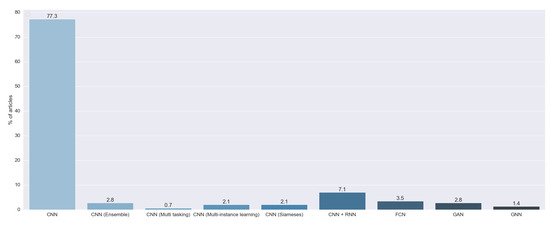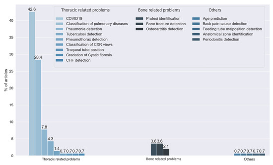 We found 17 different purposes in the reviewed articles; see Figure 6. We classified these 19 goals into three classes: thoracic problems (86.52% of the reviewed articles), bone-related problems (9.93%), and others (3.55%). It is noteworthy that most of the articles were centered on the detection of thoracic diseases. This trend had increased in 2020 and 2021 with the appearance of COVID-19. We observed that the main thoracic disease handled by the reviewed articles was pneumonia (50.35%), whether it was COVID-19-related (42.55%) or not (7.80%). Other articles addressed this disease, but with a more general goal to detect multiple pulmonary diseases (28.37%). Further, 4.26% of the reviewed articles had the detection of tuberculosis as the main purpose. Finally, from the rest of the articles that handled thoracic diseases, we found multiple purposes: the detection of pneumothorax (1.42%), the detection of cystic fibrosis (0.71%), the detection of malposition of feeding tubes (0.71%), the segmentation of tracheal tubes (0.71%), and the detection of congestive heart failure (0.71%).
