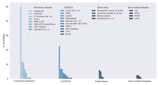 - RQ3. There were several datasets used in this context. All datasets used can be grouped depending on the anatomy region they describe. The results of this research question are coherent with those obtained with RQ1. We identified mostly two types of datasets: bone-related diseases and lung-related diseases.
