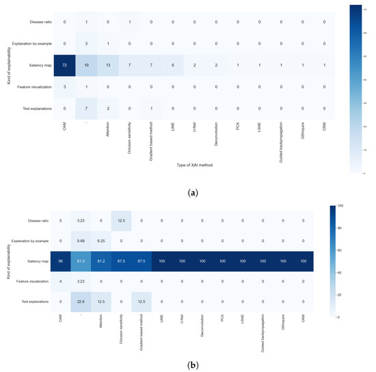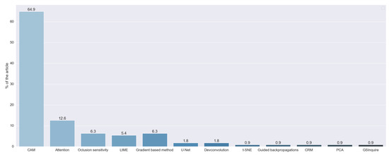 - RQ5. The reviewed studies used many different XAI methods. Most of them produced saliency maps. The usage of CAM techniques stands out, with more than half of the reviewed articles using them. The predominance of these techniques is highly related to the kind of data handled, the X-ray images, and the backbone methods (CNNs).