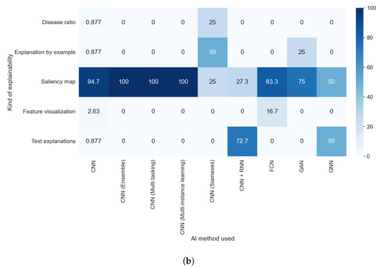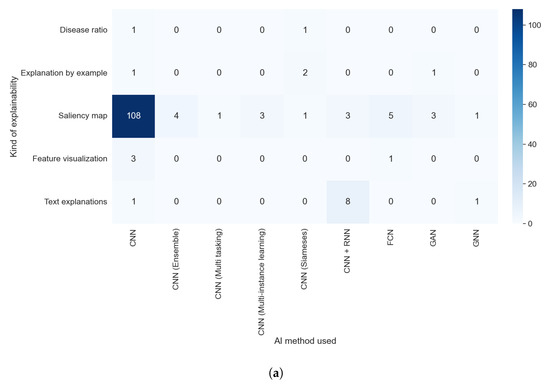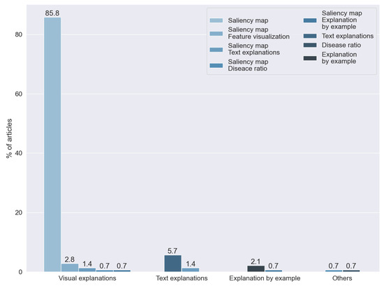 - RQ7. We identified three different kinds of explainability obtained in the reviewed studies: visual explanation, text explanation, and explanation by example. All these three categories are highly related to the method used, which is based on RQ5.