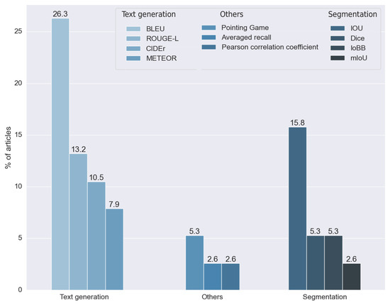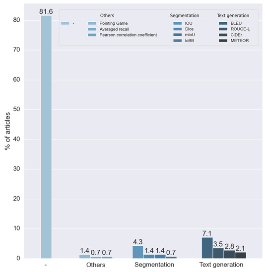 - RQ8. Our findings show that most of the reviewed articles did not use any metrics to measure the quality of the explainability. Only 18.46% of the articles used them. The methods that used metrics can be divided between those based on text generation, which used metrics to compare the generated text with ground truths, and those that output visual explanations. In this case, the metrics used were those typically used for segmentation metrics. This research question allowed us to see the absence of measurements in these methods and to see how metrics are heavily related to the data used (RQ3) and the kind of explanation (RQ7).
