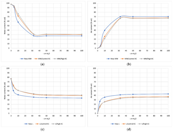 New lignite mat (New L) had high bulk density (378.15 kg m−3) and low porosity (77.07% vol). Its water holding capacity was low (41.32% vol) and it gave up water quickly, which promoted aeration of the mat and was reflected in the high air content regardless of the potential tested (Table 1 and Figure 1a–d). There was a 0.3% decrease in organic matter in mats after cucumber cultivation compared to new lignite mats. The lignite was also characterized by low plant-available water content, which was about 78.7% lower compared to the New MW mats. A beneficial feature of the amendments was the decrease in shrinkage of lignite during cultivation by 20.9% in the L/control EC treatment substrate and by 22.5% in the L/high EC treatment substrate compared to the New substrate (Table 1).