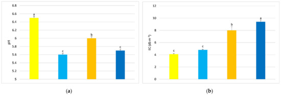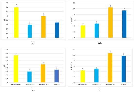 pH and EC of mineral wool and lignite mat extracts, taken from the top (a,b), middle (c,d) and bottom of the mat (e,f), respectively. Average values marked with the same letters are not significantly different within the analyzed parameter at p < 0.05. Vertical bars indicate ± standard deviation.