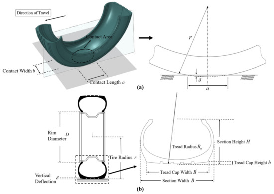 where is the tire vertical deflection. From the tire cross-section in Figure 2b, the tire radius and the tread radius can be expressed as [30],