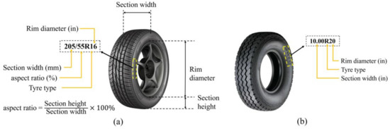 According to the tire design standards, tires are categorized in terms of the vehicle type such as the earth-mover, agricultural vehicle, truck, passenger car, and industrial vehicle [31,35,36,37,38]. The present study focused on the tires of trucks and passenger cars, as shown in Figure 4. The tire specification can be identified through the tire sidewall markings that are required to be printed at the time of production, including the tire section width, aspect ratio, type, rim diameter, etc. [39]. Some commonly used tire specifications are listed in Table 1.