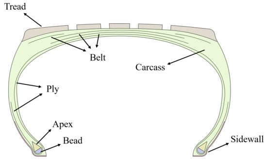 The 11.00R20 truck tire was taken as an example to demonstrate the tire modeling process. The radial tire is mainly composed of the tread, belt, carcass, bead, sidewall, apex, ply, and other parts, as shown in Figure 5. The Yeoh material model was chosen for simulating the tire rubber according to its uniaxial tensile test results [27]. Unlike the isotropic rubber material, the ply and belt of the tire are composite structures with anisotropy properties. The rebar reinforcement layer was selected to simulate the tire’s reinforced skeleton structure. The parameters of the Yeoh model and rebar model are referred to in the literature [40].