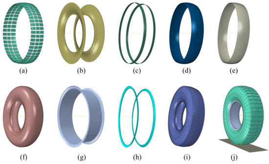Components of the FE model: (a) tread; (b) sidewall; (c) steel-belt-1; (d) steel-belt-2; (e) steel-belt-3; (f) ply; (g) rim; (h) bead and apex; (i) carcass; (j) the tire–road contact model.
