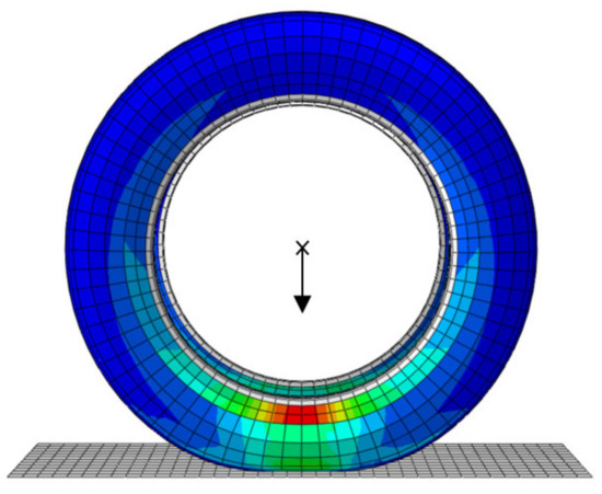 The 3D geometric model of the tire was generated through rotating the tire section shown in Figure 5 by 360° about the central axis, and different material properties were assigned to the corresponding parts. The total number of cells and nodes were 185,710 and 214,070, respectively. The rubber used the eight-node linear hexahedron element (C3D8R), and the skeleton structure used the four-node quadrilateral membrane element (M3D4R). The tire inflation pressure was realized by exerting pressure on the inner surface of the tire. The rim and the road were regarded as rigid bodies without deformation. The surface-to-surface contact type was used between the tire and the road, and binding constraints were adopted between the tire and the rim. The FE model of the truck tire in ABAQUS is shown in Figure 6. The modeling process of the passenger car tire is similar and not elaborated here.