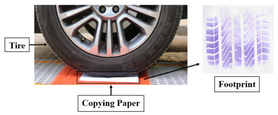 To evaluate the performance of the FE model, the tire footprint was compared with the experiment result. Figure 8 shows the field test used to obtain the tire footprint through the copying paper placed at the bottom of the tire.