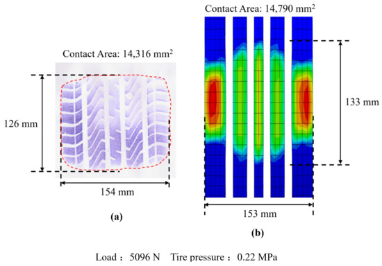 The dimensions of the obtained footprint were measured in MATLAB. The contact length is 126 mm; the contact width is 154 mm; the contact area (outer edge excluding the strip grooves) is 14,316 mm2. Meanwhile, the footprint from the FE model was also obtained as shown in Figure 9. Table 2 presents the comparison results of the footprints. The values of the contact length, contact width, and contact area are in good agreement between the simulation and measured results, and the maximum error is 5.2%, which verifies that the FE model performs well in simulating the actual tire.
