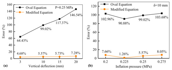 Figure 12a represents the relative error of the contact force under different vertical deflections with an inflation pressure of 0.25 MPa. It is seen that the contact force estimated by the oval equation (i.e., Equation (5)) is much larger than the simulation results, and the error increases with the increase in tire vertical deflection, with a maximum error of 146.54%. Although the error of the modified equation (i.e., Equation (9)) also increases during the vertical deflection from 3 mm to 20 mm, it is in the range of 4.68~7.28%. Figure 12b represents the relative error under different inflation pressure with constant vertical deflection. The error of the oval equation is about 100%. In contrast, the modified equation yields satisfactory results and the maximum error is 8.05%. The results indicate that the contact forces estimated by the equation based on the oval assumption have a large difference from the simulation results. On the contrary, the equation based on the modified footprint achieved excellent results in the calculation of tire force.