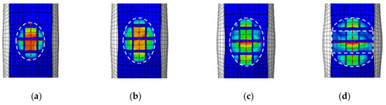The tire footprints under different vertical deflections were extracted as shown in Figure 10. It can be seen that under constant inflation pressure, the area of the tire footprint increases with the increase in tire deflection. When the vertical deflection is small and the contact width is smaller than the tread width, the footprint edge looks like a rhombus, as shown in Figure 10a. As the vertical deflection increases, the contact width reaches the tread width, and thereafter the footprint keeps increasing along the longitudinal direction. The footprint edge becomes a hexagon, as shown in Figure 10b and Figure 11d. In addition, under the constant vertical deflection, the footprint under different inflation pressure is almost the same. This implies that the footprint shape is mainly affected by the vertical deflection.