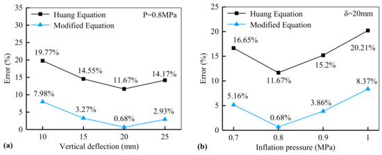 From Figure 14a,b, we can see that the change trend in the Huang equation (i.e., Equation (7)) and the modified equation (i.e., Equation (12)) is similar. Meanwhile, the force estimation error is smaller compared with that of the passenger car. The error of the Huang equation is in the range of 11.67~20.21% while the error of the modified equation is in the range of 0.68~8.37%. This means that the footprint-modified equation significantly improves the results.