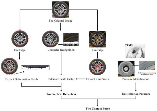 The main parameters to be measured for the contact force estimation include the inflation pressure , vertical deflection , and tire specification parameters such as , , . The authors proposed a computer vision-based method to measure those parameters. A single-lens reflex (SLR) camera is used to capture images of each tire. Then, the computer vision techniques such as the edge detection and character recognition algorithms are used to detect the edges of the tire and rim, tire vertical deflection, and tire sidewall markings from the images, as shown in Figure 15. More details can be found in Kong et al. [28].