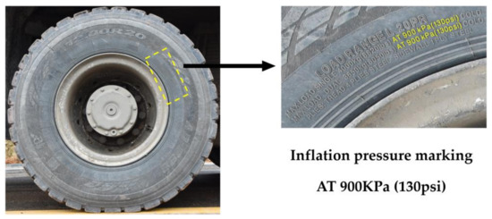 The inflation pressure can be measured remotely by pressure sensors, such as the Tire Pressure Monitor System (TPMS) equipped on most vehicles. For vehicles that do not have TPMS, such as most trucks, a computer vision-based method was proposed. Generally, the label on the tire sidewall shows the manufacturer-recommended inflation pressure value, as shown in Figure 16. Based on the statistical analysis of a large set of measured data, the ratio of the measured pressure to the manufacturer-recommended pressure is within a limited range. For heavy trucks, the ratio is in the range of 1.1–1.2 [28]. Herein, a ratio of 1.15 is assumed for a heavy truck. Thus, the inflation pressure can be estimated by multiplying the manufacturer-recommended pressure with the ratio. For example, the inflation pressure of the tire in Figure 16 is equal to 900 × 1.15 = 1035 KPa.