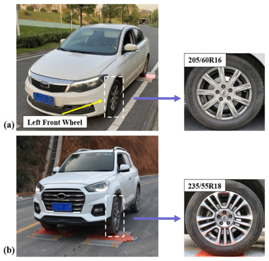 The tested passenger cars include a sedan with 205/60R16 tires and an SUV with 235/55R18 tires, as shown in Figure 18. Both cars have a TPMS.