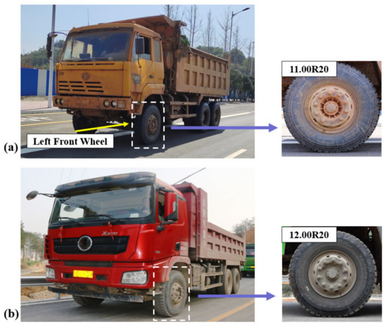One 3-axle truck equipped with 11.00R20 tires and the other with 12.00R20 tires were tested, as shown in Figure 19. For multi-axle trucks, except for the front axle, the other axles usually utilize a dual wheel system (DWS). Herein, it is assumed that the inner tire of the DWS has the same contact force as the outer tire [46,47]. It is noted that the middle and rear axles of the truck are DWSs.