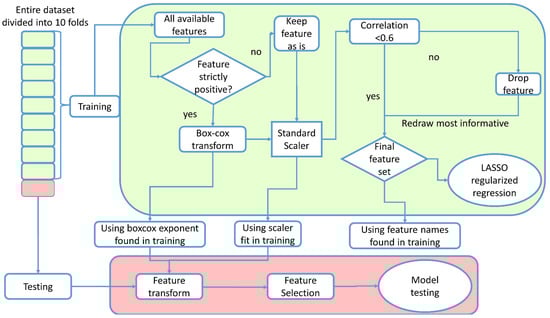 The hyperparameter search for the Lasso was carried out automatically, using an additional stratified 10-fold cross-validation in the training phase. To avoid data leakage, the entire cross-validation procedure was managed using the scikit-learn library.