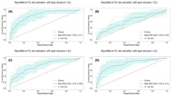 Performance of the FcNN classifier on different input features: (A) Clinical, (B) Radiological, (C) Radiomic, and (D) All available features.