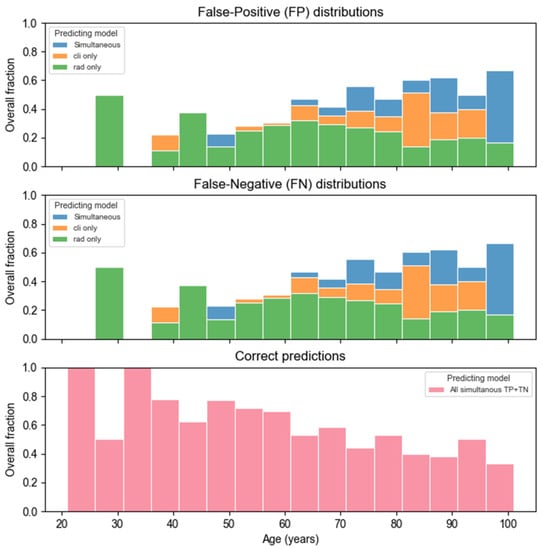 Histogram of different misclassifications individually made by the clinical (Orange), the radiomic (Green), or both simultaneously (Blue) LASSO models. The pink-colored histogram represents the distribution of the simultaneously correct predictions for both the clinical and the radiomic models. False positives are cases in which the model predicts patient mortality and the patient survives; false negatives are cases in which the model predicts that the patient survives, but the patient dies. In all cases, all the bins are normalized with the size of the population in the corresponding age range.