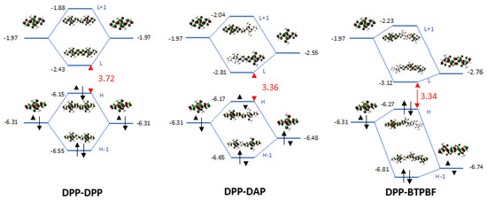 Energy levels (with values in eV) and shapes of frontier MOs of A-A’ dimers with A = DPP and A’ = DPP, DAP and BTPBF.