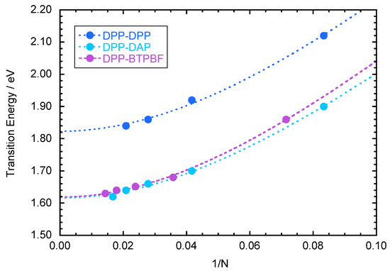 The HOMO and LUMO energies, as well as the electronic gaps calculated for increasingly large (A-A’)n oligomers are summarized in Table S3, while the optical properties are gathered in Tables S4 and S5. To no surprise, as the conjugated oligomers increased in size, the electronic gap lowered as a result of the continuous destabilization of the HOMO and stabilization of the LUMO. Consistently, the optical gap decreased when increasing the conjugated chain length, while the oscillator strength increased. The evolution of the transition energies ∆E as a function of 1/N (with N the number of double bonds along the conjugated path) is shown in Figure 3. The transition energies extrapolated using Equation (1) are 1.82 eV for A’ = DPP, and 1.62 eV for DAP and BTPBF.