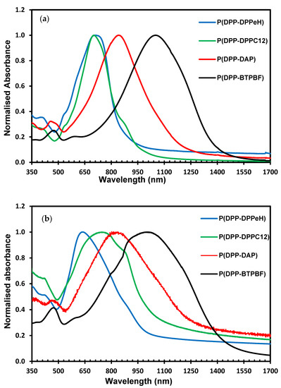 Normalized absorption spectra of A-A’ copolymers P(DPP-DPPeH), P(DPP-DPPC12), P(DPP-DAP), and P(DPP-BTPBF); (a) in chlorobenzene solutions; (b) in thin films (spin coated from chlorobenzene solutions).