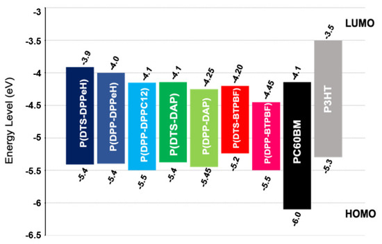 The HOMO-LUMO band gap determined with monomers showed a strong decrease in the order DPP, DAP, and BTBPF (2.2, 1.8, and 1.3 eV, respectively). Both HOMO and LUMO levels were affected by changing the structure. All these energy levels are reported in Figure 5, and presented with poly(3-hexylthiophene) (P3HT) and PCBM, for comparison. When comparing the A-A’ copolymers, the main observation is that LUMO levels were deepened in correlation with the electron affinity of the comonomer combined with DPP, as it was already observed when copolymerized with DTS. HOMO levels were only slightly modified and were about −5.0 eV on average. When comparing the series of P(DTS-A) copolymers to P(DPP-A) copolymers with the same A, replacing DTS by DPP provoked the lowering of both LUMO and HOMO levels in the same manner, leading to unmodified bandgaps, as already observed with optical gaps. In the case of P(DTS-BTPBF) and P(DPP-BTPBF) also, the change of DTS by DPP strongly affected both HOMO and LUMO levels by roughly 0.25 eV, leading to deeper levels without perturbating the bandgaps. Thus, the P(DPP-BTPBF) copolymer exhibited very deep HOMO and LUMO levels at −5.5 and −4.4 eV, respectively.