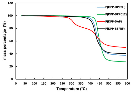 TGA of copolymers P(DPP-DPPeH), P(DPP-DPPC12), P(DPP-DAP), and P(DPP-BTPBF) with a heating ramp of 10 °C min−1 up to 600 °C under N2 flux.