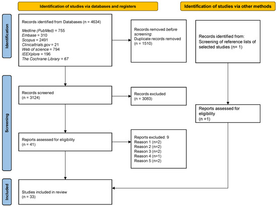 The bibliographic scan retrieved 4634 suitable items. After removing duplicates, 3124 records underwent the finer selection described above, allowing the exclusion of a further 3083 results. Out of the remaining 41 papers, after a full text reading, 9 were excluded due to the following reasons: (1) they did not focus on dental implant osseointegration (but on other aspects of dental implant therapy, e.g., pain or swelling); (2) they focused on the treatment of bone fractures; (3) physical stimulations different from MFs were used; (4) the description of the magnetic stimulation lacked coherence; (5) bone cells were not cultured on Ti surfaces. Table of the excluded full-texts is provided in Supplementary Material (Table S2).