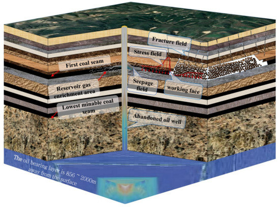 Coal and oil resources co-storage areas are predominant in Songliao, Junggar, Tarim, Qaidam, and Ordos Basins in China [1,2]. The Shuangma coal mine in eastern Ningxia is in the coal and oil resources co-storage area in the Ordos Basin (Figure 1). The coal mine contains numerous abandoned oil wells that were left over from early oil exploration and connect the coal seam and the oil-bearing layer. After over 60 years of precipitation, the gas in the oil-bearing layer accumulates in the oil well cavity and generates a high pressure. The pressure provides continuous power for the oil and gas and promotes their diffusion into the coal mass fracture, forming an oil–gas accumulation area around abandoned oil wells [3]. During oil and gas enrichment, the initiation, propagation, coalescence, expansion failure, and rapid release of accumulated coal mass fracture stress [4] can induce dynamic disasters, such as coal mass instability/collapse and oil–gas diffusion. The essence of dynamic disaster in the co-storage area of coal and oil resources is the failure mechanism of coal and rock mass. Therefore, the fundamental studies on the dynamic evolution characteristics of coal mass fractures in coal and oil resources co-storage areas are vital to warning against dynamic disasters.
