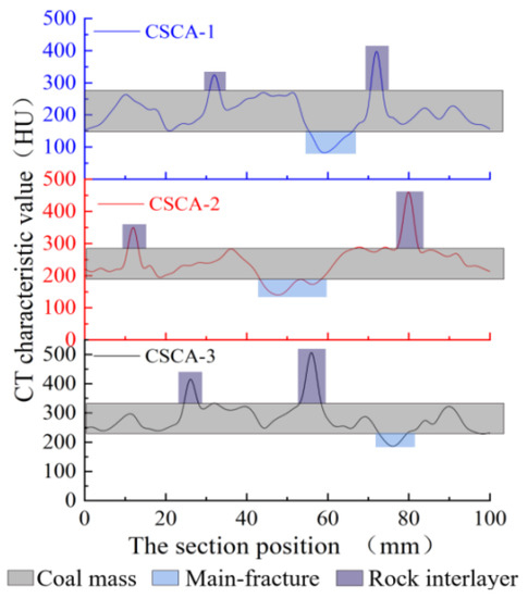 The micro-fractures of rock samples (scale = 0.001 mm) are typically difficult to identify because of the low-resolution scale of the CT scanner (medical = 0.3 mm and industrial = 0.01 mm). The average CT number method is currently the most widely used damage detection CT method. The CT number is the relative value of the linear attenuation coefficient of a tissue structure in a CT image, and the unit is HU. The CT number reflects the density of the object being scanned, and the density is directly proportional to the CT number. Therefore, fracture and mineral particles in coal mass are important factors that affect the CT number [11].