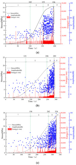 The fracture evolution of coal mass in Shuangma was categorized into four stages based on the stress–strain curve of rock subjected to uniaxial compression [25,26]. The stages were compaction (I), linearly elastic (II), rapidly fracturing (III), and post-peak (IV) stages. The stress, time, energy, and amplitude during loading are illustrated in Figure 4.