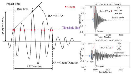 The proportions of the three eigenvalues in Equation (5) are obtained using Equation (4). OHTSU [19] categorized acoustic emission events in uniaxial compression coal and rock mass into tension- and shear-type crack events based on waveform characteristics and the relationship among rise time peak amplitude and count duration ratios (RA–AF). MDC ≥ 60% indicates shear fracture, MDC ≤ 40% indicates tensile fracture, and 40% < MDC < 60% indicates mixed fracture.